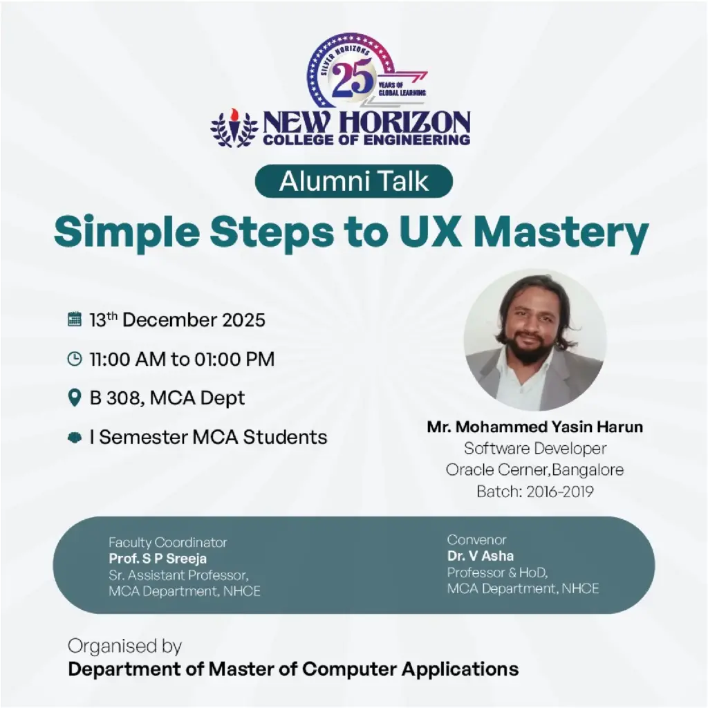 Alumni Talk 2024-2025 Alumni Talk on Simple Steps to UX Mastery The Department of MCA organised an Alumni Talk on “Simple Steps to UX Mastery” on 13-12-2025. The event aimed to introduce students to the core principles of User Experience design and its relevance in modern digital product development. Mr. Mohammed Yasin Harun, Research Engineer […]