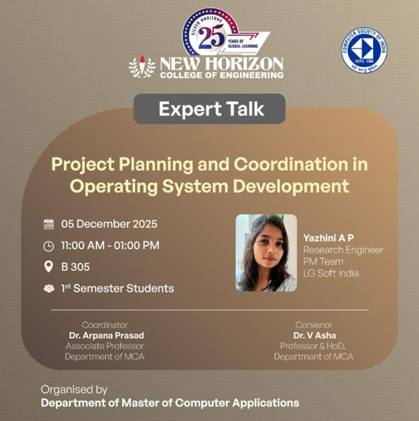 SEMINARS AND WORKSHOPS Expert Talk on Project Planning and Coordination in OS Development The Department of MCA hosted an expert session on December 5, 2025, featuring Ms. Yazhini A P, Research Engineer at LG Soft India. The talk focused on structured planning, resource allocation, and cross-functional coordination in operating system development. Key topics included requirement analysis, milestone […]